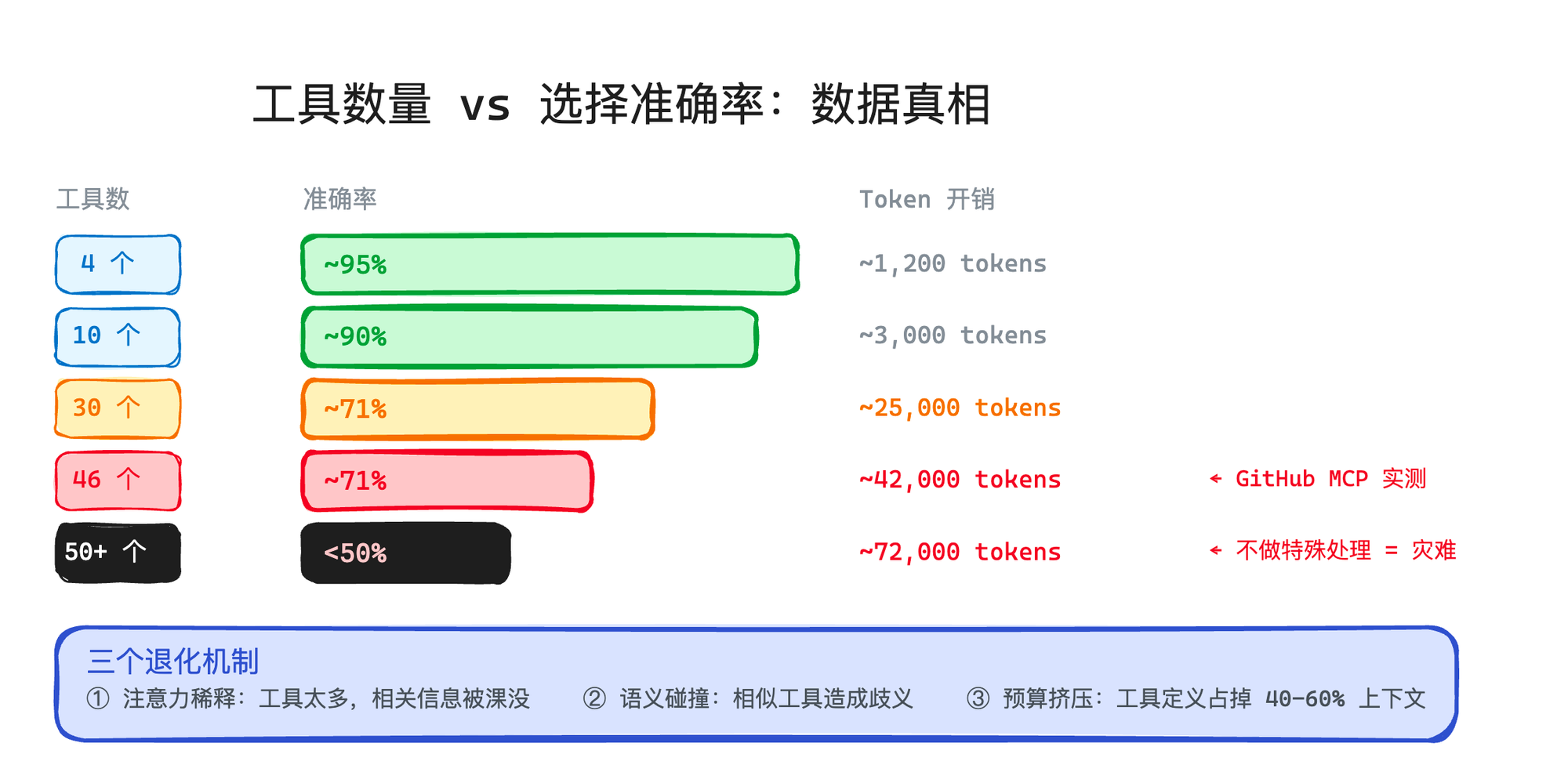 第一:注意力稀释。 工具越多,每个工具的描述在上下文里占的比例越小。模型的注意力被分散了,就像你同时看 50 个菜单页,反而不知道点什么。